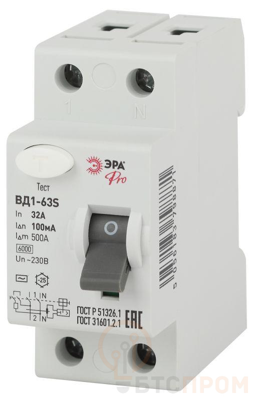 –Выключатель дифференциального тока (УЗО) 1P+N 32А 100мА ВД1-63S Pro NO-902-153 ЭРА Б0036858
