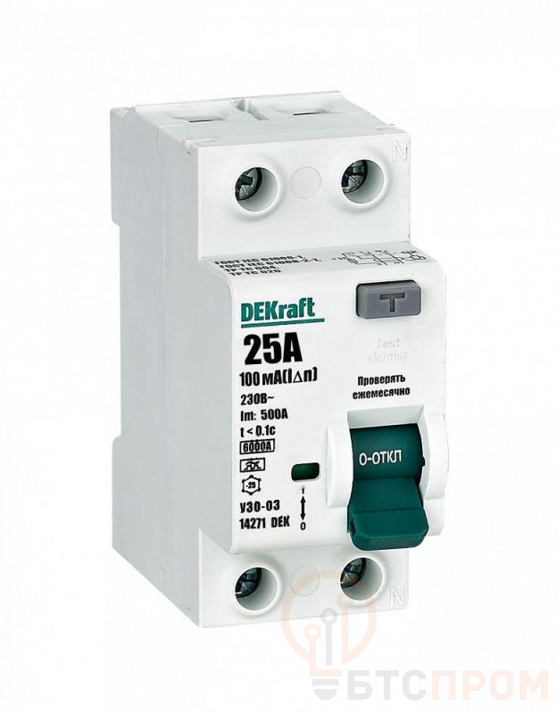Выключатель дифференциального тока серии УЗО-03 Dekraft; 2P; номинальный ток 25 А; ном.дифф. ток 100 мА; электромеханический; тип дифференциального расцепителя - A; ВДТ применяются для защиты человека от поражения электрическим током и электроустановок от риска возникновения пожаров вследствие утечек тока. Конструкция устройств позволяет эксплуатировать их даже при низкой температуре.