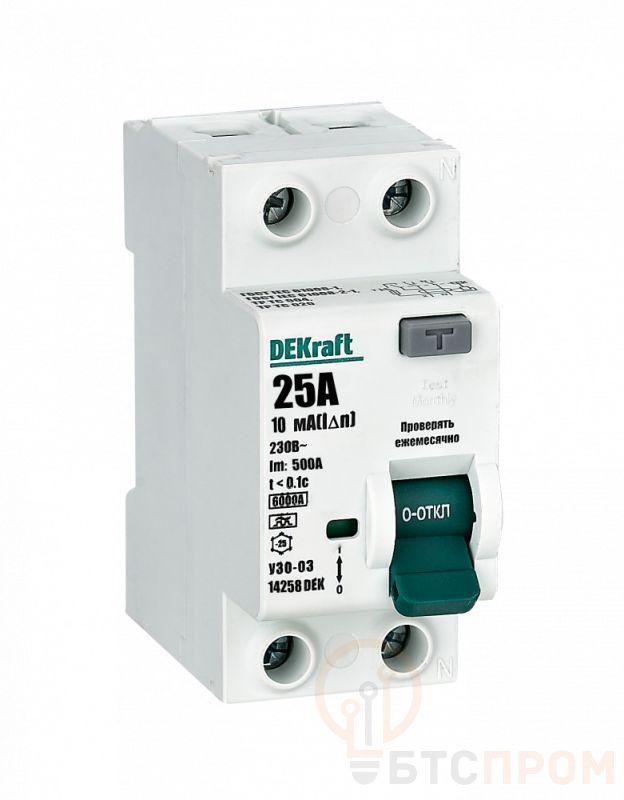 Выключатель дифференциального тока серии УЗО-03 Dekraft; 2P; номинальный ток 10 А; ном.дифф. ток 10 мА; электромеханический; тип дифференциального расцепителя - A; на DIN-рейку. ВДТ устанавливаются в сетях напряжением до 400 В пер.тока. ВДТ применяются для защиты электроустановок от риска возникновения пожаров вследствие утечек тока. Конструкция устройств позволяет эксплуатировать их даже при низкой температуре. При сборке выключатель дифференциального тока (ВДТ) и автоматический выключатель (для защиты ВДТ) устанавливаются последовательно, при этом номинальный ток аппарата должен быть на одну ступень выше — т. е. 20А при установке последовательно с автоматом на 16А, 32А при установке с автоматом на 25А.