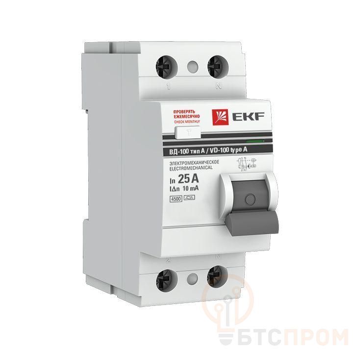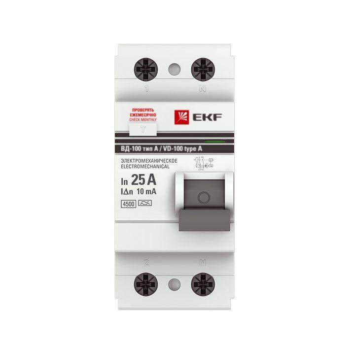 Выключатель дифференциального тока (УЗО) 2п 25А 10мА тип A ВД-100 (электромех.) PROxima EKF elcb-2-25-10-em-a-pro