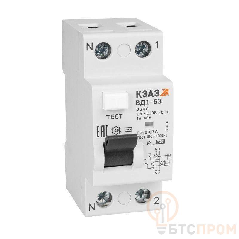 Двухполюсное устройство защитного отключения на номинальный ток 25 А, номинальный отключающий дифференциальный ток 30 мА и рабочее напряжение переменного тока 230 В.