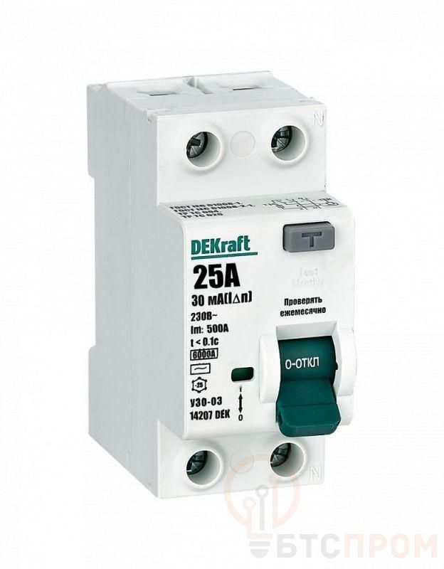 Выключатель дифференциального тока серии УЗО-03 Dekraft; 2P; номинальный ток 25 А; ном.дифф. ток 30 мА; электромеханический; тип дифференциального расцепителя - AC; на DIN-рейку. ВДТ устанавливаются в сетях напряжением до 400 В пер.тока. ВДТ применяются для защиты электроустановок от риска возникновения пожаров вследствие утечек тока. Конструкция устройств позволяет эксплуатировать их даже при низкой температуре. При сборке выключатель дифференциального тока (ВДТ) и автоматический выключатель (для защиты ВДТ) устанавливаются последовательно, при этом номинальный ток аппарата должен быть на одну ступень выше — т. е. 20А при установке последовательно с автоматом на 16А, 32А при установке с автоматом на 25А.
