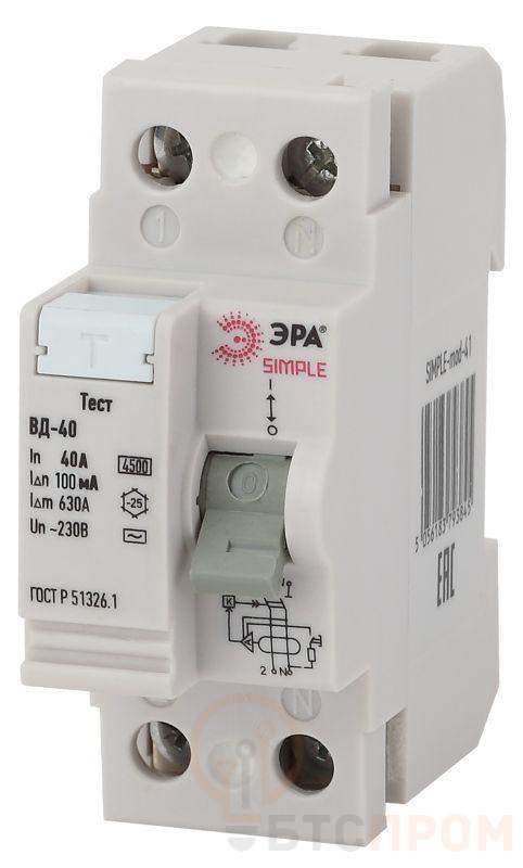 Выключатель дифференциального тока (УЗО) 2п 40А/100мА ВД-40 (электронное) SIMPLE-mod-47 ЭРА Б0039267