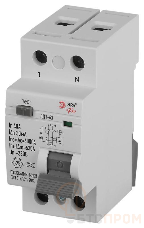 Выключатель дифференциального тока (УЗО) 2п 40А 30мА тип А электромех. ВД1-63 PRO VD2EM40A30 ЭРА Б0061769