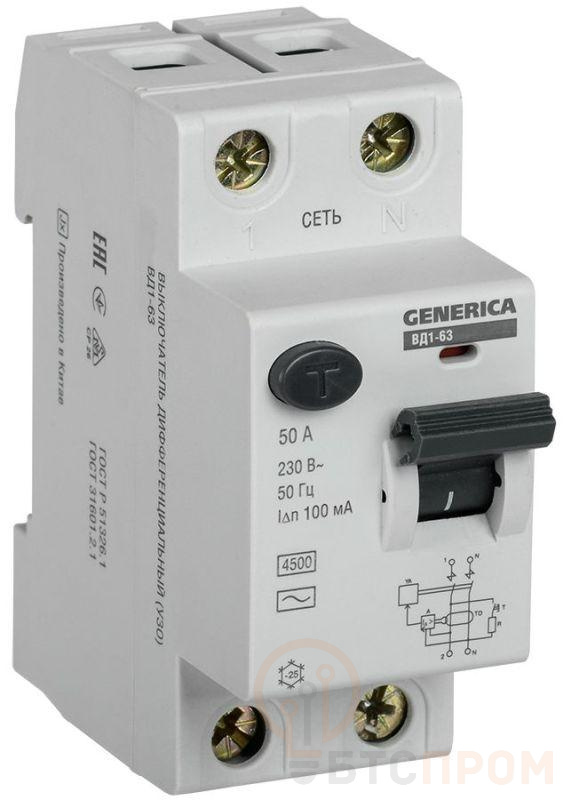Выключатель дифференциального тока (УЗО) 2п 50А 100мА тип AC ВД1-63 GENERICA MDV15-2-050-100 фото в каталоге от BTSprom.by
