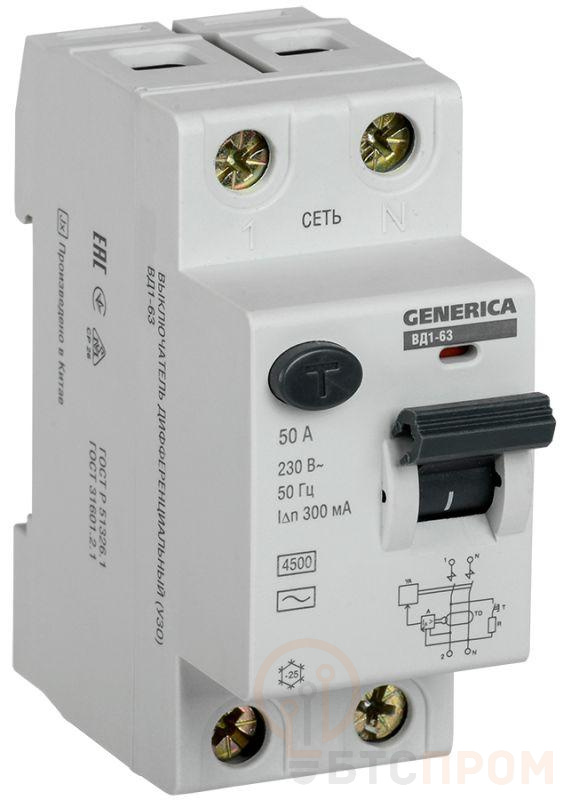 Выключатель дифференциального тока (УЗО) 2п 50А 300мА тип AC ВД1-63 GENERICA MDV15-2-050-300 фото в каталоге от BTSprom.by