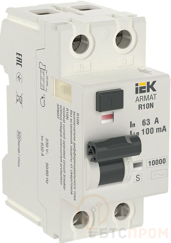 Выключатель дифференциального тока (УЗО) 2п 63А 100мА тип AC-S ВДТ R10N ARMAT IEK AR-R10N-2-063CS100