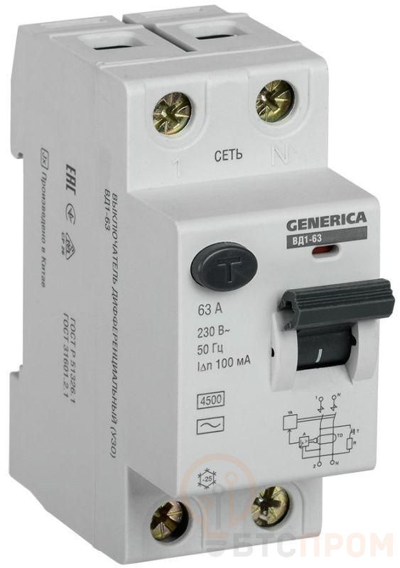 Выключатель дифференциального тока (УЗО) 2п 63А 100мА тип AC ВД1-63 GENERICA MDV15-2-063-100