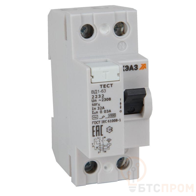 Двухполюсное устройство защитного отключения на номинальный ток 63 А, номинальный отключающий дифференциальный ток 100 мА и рабочее напряжение переменного тока 230 В.