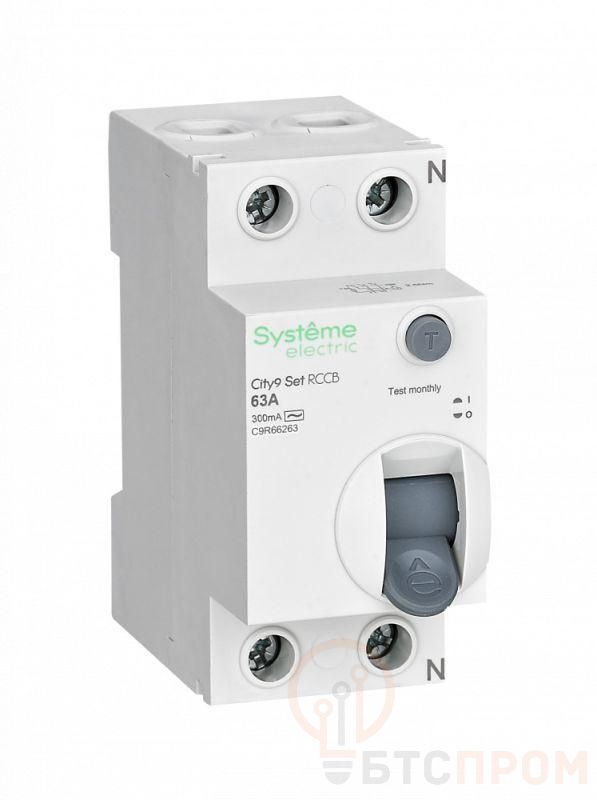 Выключатель дифференциального тока (ВДТ) или устройство защитного отключения (УЗО) серии City9 Set Systeme Electric, 2-полюсный, номинальный ток 63А, ток утечки 300 мА, тип АС, электромеханический. Применяется в электрических сетях напряжением 230В. Уставка по току утечки 300 мА обеспечивает гарантированную защиту людей при прямом и косвенном прикосновении. Кнопка тест обеспечивает проверку работоспособности аппарата. Крепление на DIN-рейку шириной 35 мм. Подключение сверху и снизу. Безопасные клеммы.