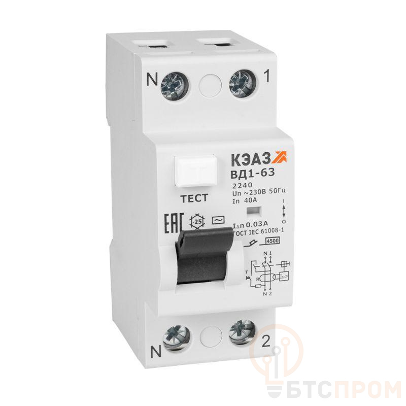 Двухполюсное устройство защитного отключения на номинальный ток 63 А, номинальный отключающий дифференциальный ток 30 мА и рабочее напряжение переменного тока 230 В.