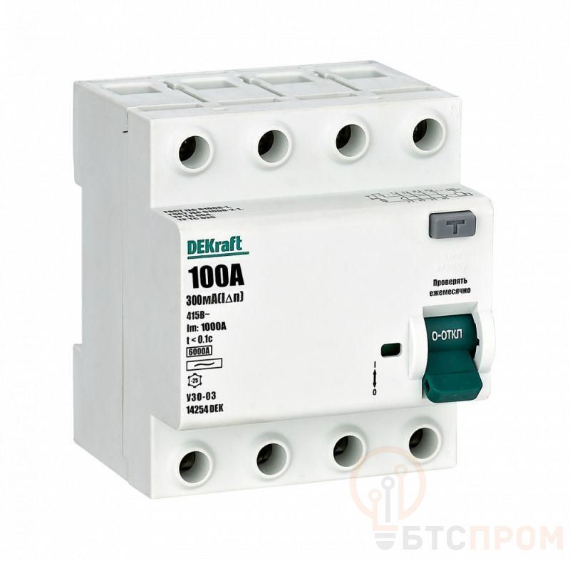 Выключатель дифференциального тока серии УЗО-03 Dekraft; 4P; номинальный ток 100 А; ном.дифф. ток 300 мА; электромеханический; тип дифференциального расцепителя - AC; на DIN-рейку. ВДТ устанавливаются в сетях напряжением до 400 В пер.тока. ВДТ применяются для защиты электроустановок от риска возникновения пожаров вследствие утечек тока. Конструкция устройств позволяет эксплуатировать их даже при низкой температуре. При сборке выключатель дифференциального тока (ВДТ) и автоматический выключатель (для защиты ВДТ) устанавливаются последовательно, при этом номинальный ток аппарата должен быть на одну ступень выше — т. е. 20А при установке последовательно с автоматом на 16А, 32А при установке с автоматом на 25А.