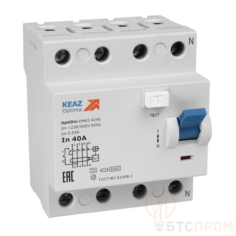 4 полюсное устройство защитного отключения на номинальный ток 25 А, номинальный отключающий дифференциальный ток 30 мА и рабочее напряжение переменного тока 400 В.