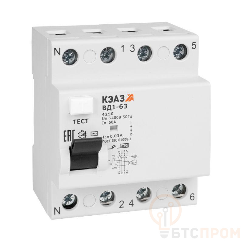 Четырехполюсное устройство защитного отключения на номинальный ток 32 А, номинальный отключающий дифференциальный ток 100 мА и рабочее напряжение переменного тока 400 В.