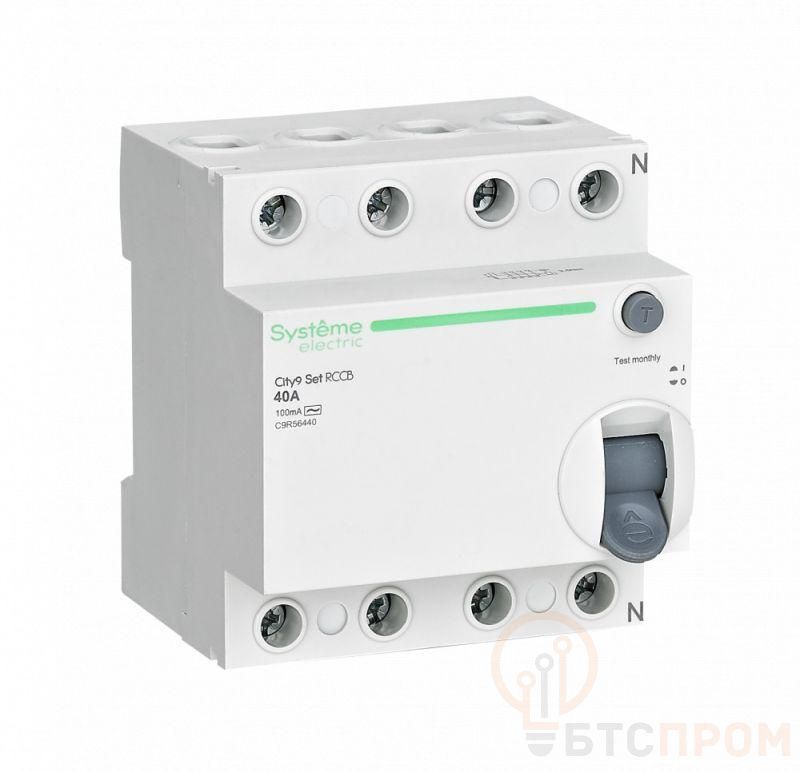 Выключатель дифференциального тока (ВДТ) или устройство защитного отключения (УЗО) серии City9 Set Systeme Electric, 4-полюсный, номинальный ток 40А, ток утечки 100 мА, тип АС, электромеханический. Применяется в электрических сетях напряжением 400В. Уставка по току утечки 100 мА обеспечивает гарантированную защиту людей при прямом и косвенном прикосновении. Кнопка тест обеспечивает проверку работоспособности аппарата. Крепление на DIN-рейку шириной 35 мм. Подключение сверху и снизу. Безопасные клеммы.
