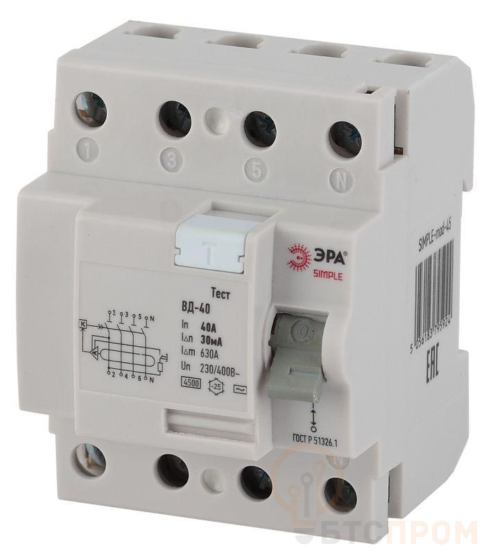 Выключатель дифференциального тока (УЗО) 4п 40А/30мА ВД-40 (электронное) SIMPLE-mod-45 ЭРА Б0039265 фото в каталоге от BTSprom.by