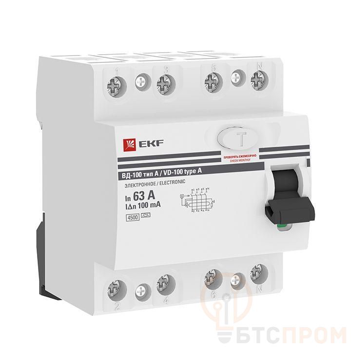 Выключатель дифференциального тока (УЗО) 4п 63А 100мА тип A ВД-100 электрон.PROxima EKF elcb-4-63-100-e-a-pro
