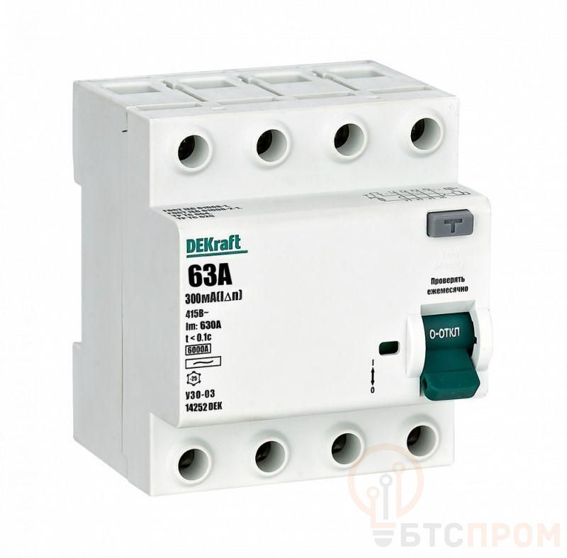 Выключатель дифференциального тока серии УЗО-03 Dekraft; 4P; номинальный ток 63 А; ном.дифф. ток 300 мА; электромеханический; тип дифференциального расцепителя - AC; на DIN-рейку. ВДТ устанавливаются в сетях напряжением до 400 В пер.тока. ВДТ применяются для защиты электроустановок от риска возникновения пожаров вследствие утечек тока. Конструкция устройств позволяет эксплуатировать их даже при низкой температуре. При сборке выключатель дифференциального тока (ВДТ) и автоматический выключатель (для защиты ВДТ) устанавливаются последовательно, при этом номинальный ток аппарата должен быть на одну ступень выше — т. е. 20А при установке последовательно с автоматом на 16А, 32А при установке с автоматом на 25А.