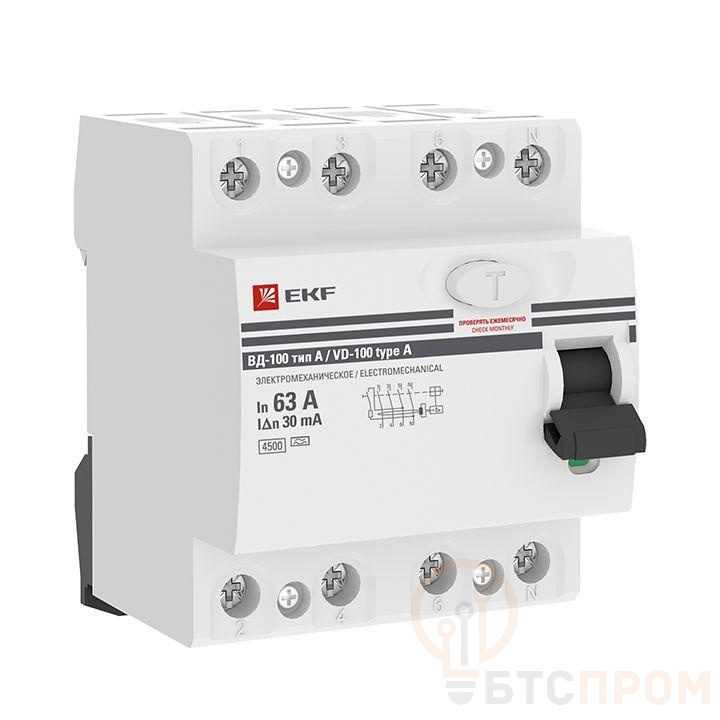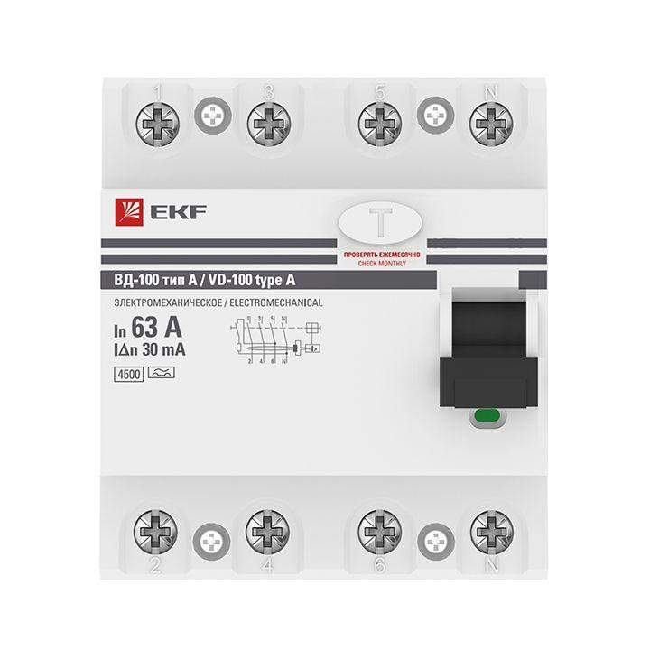 Выключатель дифференциального тока (УЗО) 4п 63А 30мА тип A ВД-100 (электромех.) PROxima EKF elcb-4-63-30-em-a-pro
