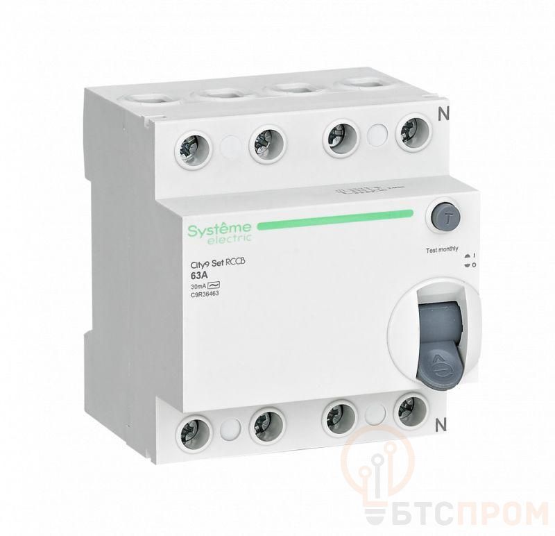 Выключатель дифференциального тока (ВДТ) или устройство защитного отключения (УЗО) серии City9 Set Systeme Electric, 4-полюсный, номинальный ток 63А, ток утечки 30 мА, тип АС, электромеханический. Применяется в электрических сетях напряжением 400В. Уставка по току утечки 30 мА обеспечивает гарантированную защиту людей при прямом и косвенном прикосновении. Кнопка тест обеспечивает проверку работоспособности аппарата. Крепление на DIN-рейку шириной 35 мм. Подключение сверху и снизу. Безопасные клеммы.