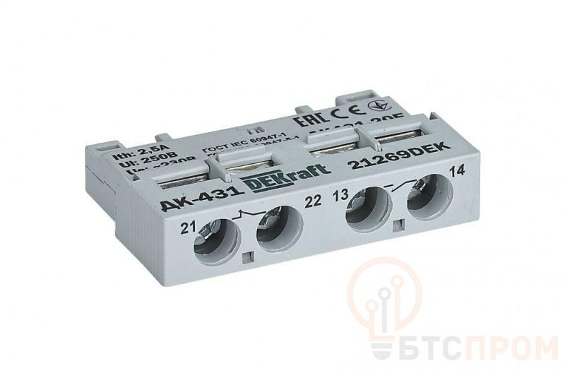 Дополнительные контакты серии ДК-431 F Dekraft; фронтальная установка; кол-во и тип контактов - 1НО+1НЗ; ток терм. стойкости 2,5 А. Дополнительные контакты серии ДК-431 F предназначены для сигнализации о состоянии главных контактов автоматических выключателей ВА-431: включены - выключены. Переключение контактов ДК-431 F происходит, даже если рукоятка управления выключателя удерживается во взведенном положении.