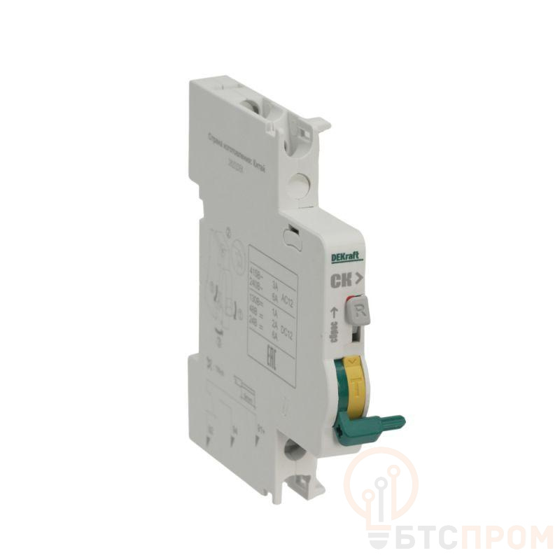 Контакт сигнальный СК-101 для автоматических выключателей серии ВА-101 Dekraft; предназначен для сигнализации аварийного срабатывания выключателя; тип контакта переключающий; ширина 9 мм; присоединение к выключателю слева.