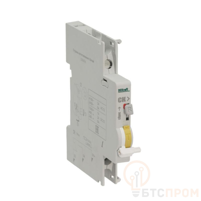 Контакт сигнальный СК-105 для автоматических выключателей серии ВА-105 и ВА-105 DC Dekraft; предназначен для сигнализации аварийного срабатывания выключателя; тип контакта переключающий; ширина 9 мм; присоединение к выключателю слева.