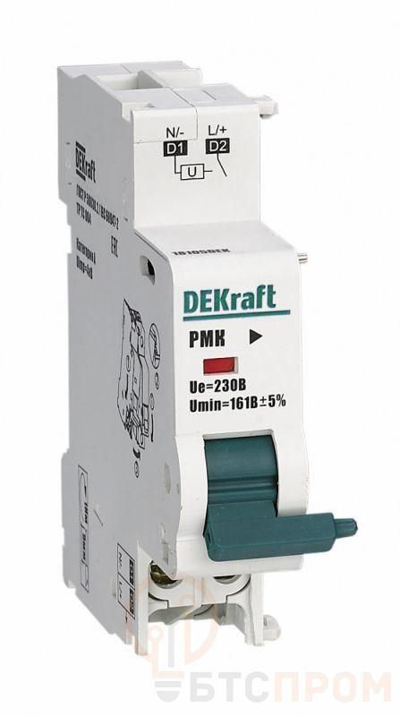 Расцепитель максимального напряжения РМК-101 для серий ВА-101, ВА-103 NEW, ДИФ-101, ДИФ-101S, ДИФ-102, ДИФ-103 4,5кА NEW; предназначен для дистанционного отключения выключателя при повышении напряжения; ном. напряжение 220 В; порог срабатывания 280 В; потр.мощность 3 ВА; ширина 18 мм; установка на DIN-рейку; присоединение к аппарату слева.