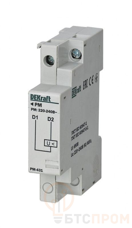 Расцепитель минимального напряжения серии РМ-431 Dekraft; ном. переменное напряжение 380-400 В; напр. срабатывания 70-110% от номинального; установка в корпус автоматического выключателя ВА-431 справа. Расцепитель минимального напряжения РМ-431 - шунтовой расцепитель, который даёт возможность 3-х полюсному автоматическому выключателю серии ВА-431 размыкаться или замыкаться с временной задержкой или без неё в тех случаях, когда напряжение на выводах расцепителя снижается ниже заранее установленного значения