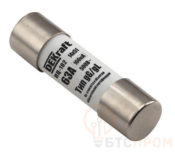Предохранитель цилиндрический серии ПЦ-102 Dekraft; категория – gG; габарит - C14 (14 x 51 мм); номинальный ток 63 А; установка – в держателях на DIN- рейку; рабочее положение - любое, но предпочтительнее вертикальное. Цилиндрические предохранители применяются для защиты сигнальных, управляющих электрический цепей (класс gG) от перегрузки и токов КЗ в сетях напряжением до 500 В. Предохранители устанавливаются в шкафах управления и распределительных щитах низкого напряжения.