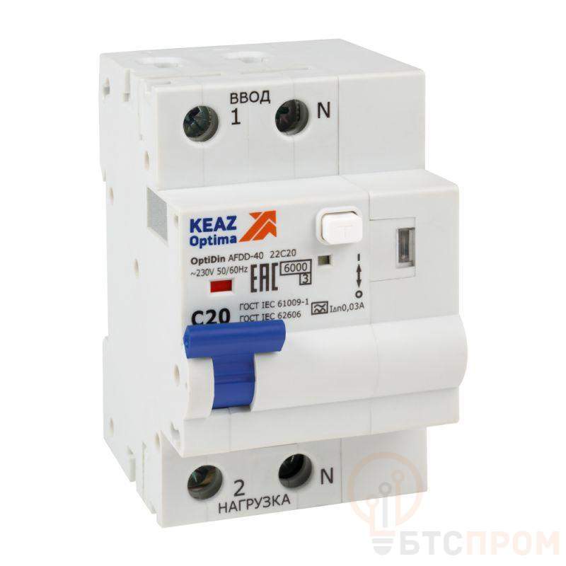 Устройство защиты от дугового пробоя с АВДТ и защ. от пов. напряж. OptiDin AFDD-40-22C20-A-У3 (2P C20 30mA Uоткл 275В) КЭАЗ 339088