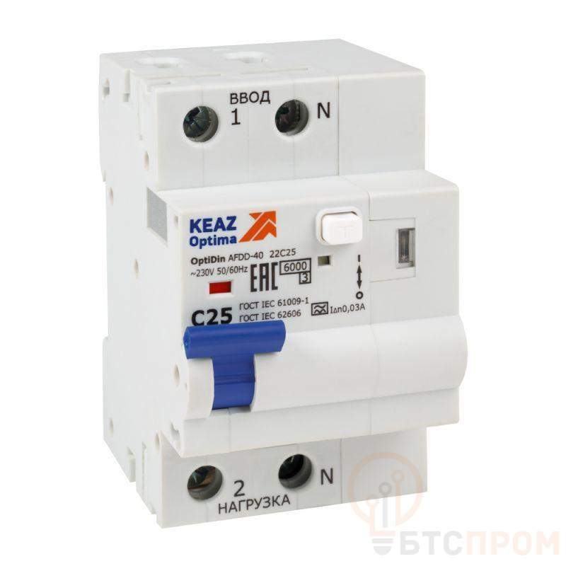 Устройство защиты от дугового пробоя с АВДТ и защ. от пов. напряж. OptiDin AFDD-40-22C25-A-У3 (2P C25 30mA Uоткл 275В) КЭАЗ 339089