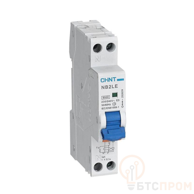Автоматические выключатели дифференциального тока (АВДТ) серии NB2LE предназначены для применения в однофазных сетях переменного тока напряжением до 230/240 В частотой 50/60 Гц с номинальным током до 40 А для нечастых включений и отключений нагрузок, а также защиты от перегрузки, короткого замыкания, поражения электрическим током при косвенных прикосновениях и возгораний по причине утечки тока в электроустановках жилых, общественных и промышленных зданий. Необходимо проверять работоспособность АВДТ серии NB2LE нажатием на кнопку «Тест» не реже 1 раза в месяц. Основные характеристики: Номинальный ток – от 6 А до 40 А Исполнение по числу полюсов – 1P+N Тип характеристики мгновенного срабатывания – В, С Отключающая способность – до 6000 А Ном. отключающий дифференциальный ток – 30 мA; 100 мA; 300 мA Тип АВДТ – AC Конструктив устройства – электронный Механическая износостойкость – 10000 циклов В/О Электрическая износостойкость – 4000 циклов В/О Степень загрязнения – 2 Степень защиты – IP20 Монтаж – на симметричную DIN-рейку 35 мм Подключение нагрузки – снизу Сигнализация – окошко индикации положения главных контактов