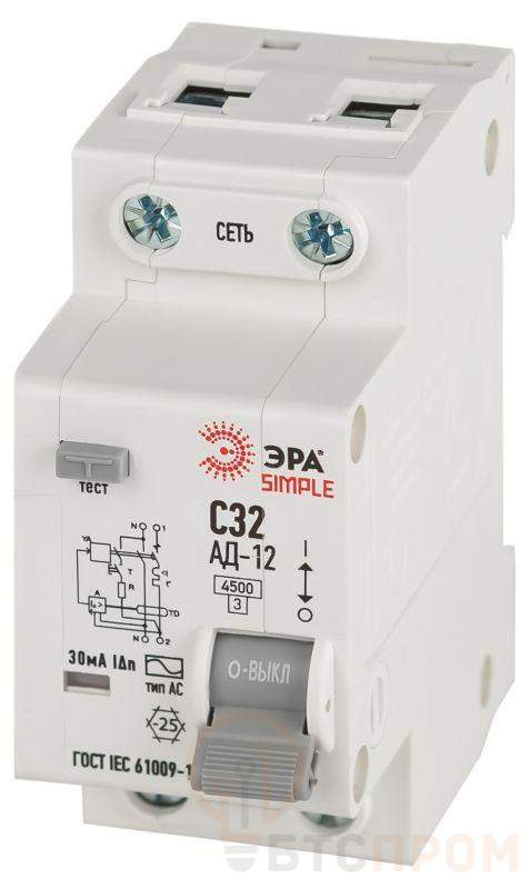 Выключатель автоматический дифференциального тока 1P+N C 32А 30мА тип АС АВДТ 4.5кА SIMPLE D12E2C32AC30 АД-12 электронное Эра Б0058923