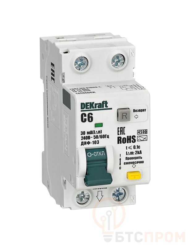Выключатель автоматический дифференциального тока 2п (1P+N) C 6А 30мА тип A 4.5кА ДИФ-103 DEKraft 16586DEK