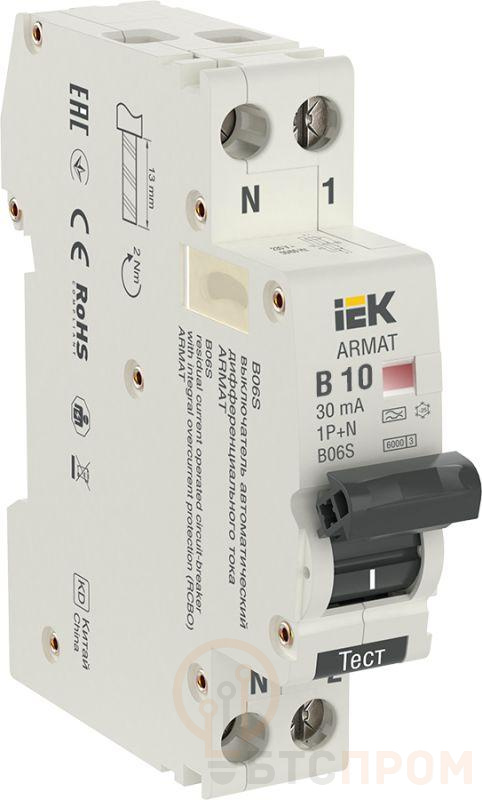 Выключатель автоматический дифференциального тока 2п (1P+N) B 10А 30мА тип A АВДТ B06S 18мм ARMAT IEK AR-B06S-1N-B10A030
