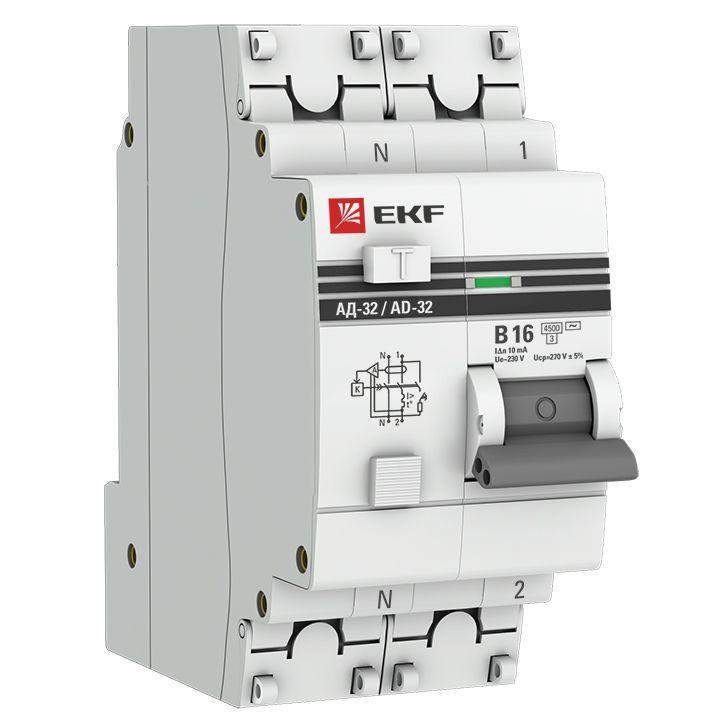 Выключатель автоматический дифференциального тока 2п (1P+N) B 16А 10мА тип AC 4.5кА АД-32 защита 270В электрон. PROxima EKF DA32-16-B-10-pro