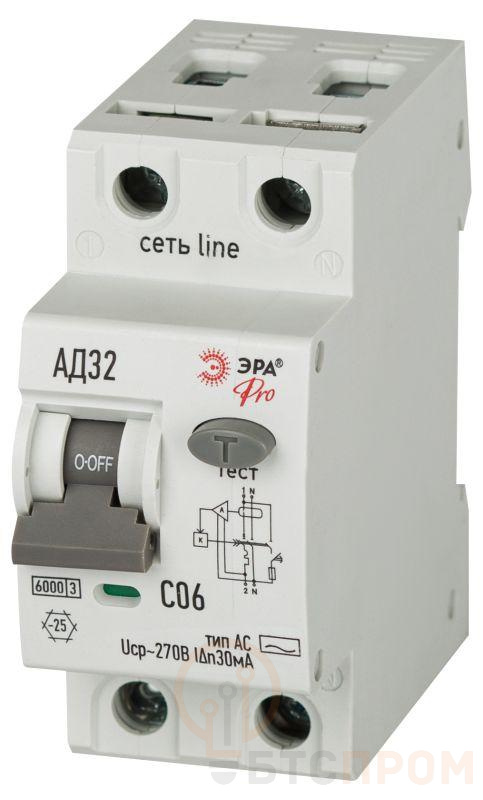 Выключатель автоматический дифференциального тока 2п (1P+N) C 06А 30мА тип AC 6кА АД-32 электрон. защита 230В PRO D326E2C06AC30P Эра Б0059109