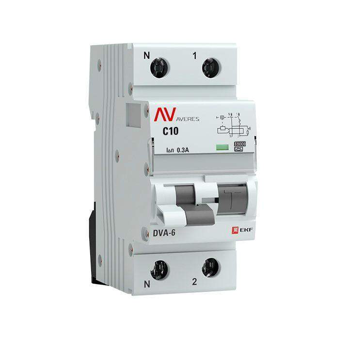 Выключатель автоматический дифференциального тока 2п (1P+N) C 10А 300мА тип A 6кА DVA-6 Averes EKF rcbo6-1pn-10C-300-a-av