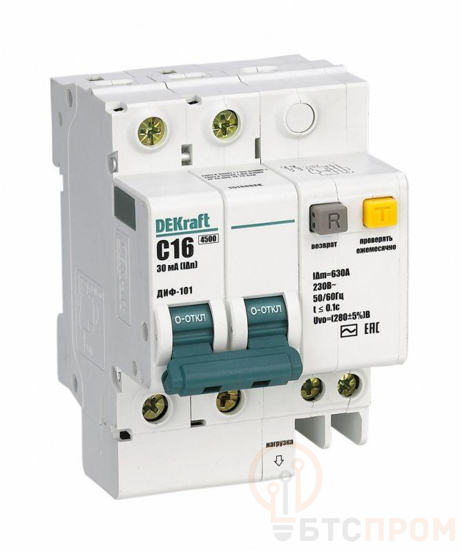 Автоматический выключатель дифференциального тока серии ДИФ-101 Dekraft; 2P; ном.ток 10 А; характеристика C; с защитой от повышения напряжения >280 В; откл.способность Icn = 4,5 kA; ток утечки 30 мА; блок дифф.защиты – электронный; ширина – 3,5 мод. х 18 мм; монтаж – на DIN-рейку. АВДТ применяются в сетях напряжением до 400 В пер.тока для защиты электроустановок от сверхтоков и токов утечки. Для расширения функционала АВДТ возможно использование аксессуаров от выключателей серии ВА-101.