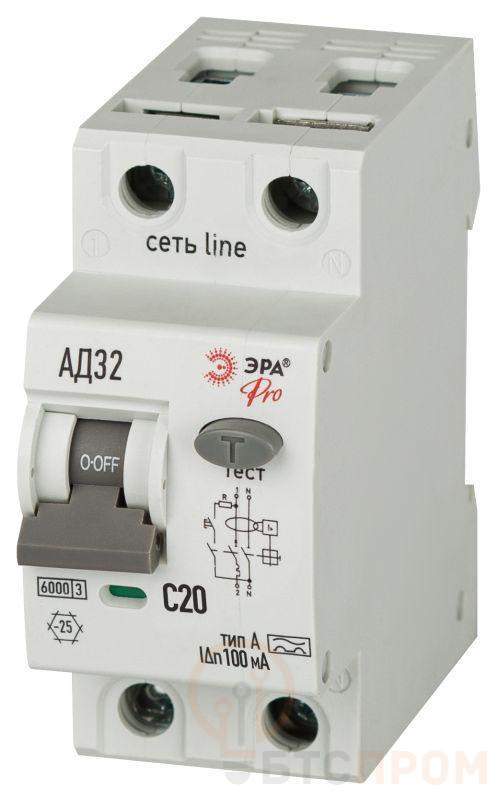 Выключатель автоматический дифференциального тока 2п (1P+N) C 20А 100мА тип А 6кА АД-32 электромехан. PRO D326M2C20А100 Эра Б0059088