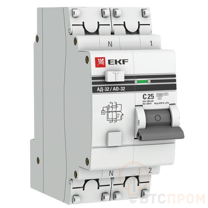 Выключатель автоматический дифференциального тока 2п (1P+N) C 25А 100мА тип AC 4.5кА АД-32 защита 270В электрон. PROxima EKF DA32-25-100-pro