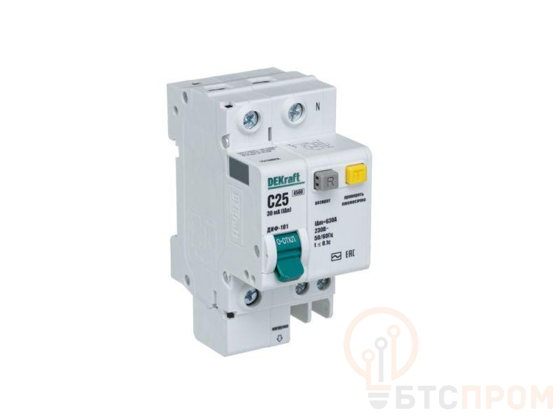 Автоматический выключатель дифференциального тока серии ДИФ-101 Dekraft; 1P+N; ном.ток 25 А; характеристика C; откл.способность Icn = 4,5 kA; ток утечки 30 мА; блок дифф.защиты – электронный; ширина – 2,5 мод. х 18 мм; монтаж – на DIN-рейку. АВДТ применяются в сетях напряжением до 220 В пер.тока для защиты электроустановок от сверхтоков и токов утечки. Для расширения функционала АВДТ возможно использование аксессуаров от выключателей серии ВА-101.