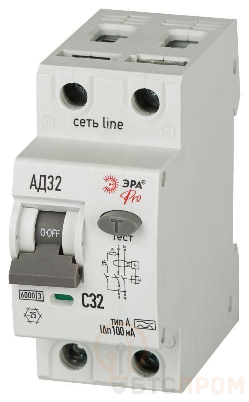 Выключатель автоматический дифференциального тока 2п (1P+N) C 32А 100мА тип А 6кА АД-32 электромехан. PRO D326M2C32А100 Эра Б0059090