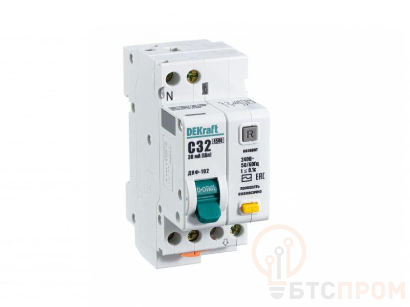 Автоматический выключатель дифференциального тока серии ДИФ-102 Dekraft; 1P+N; ном.ток 32 А; характеристика C; откл.способность Icn = 4,5 kA; ток утечки 30 мА; тип - АС; блок дифф.защиты – электронный; ширина – 2 мод. х 18 мм; монтаж – на DIN-рейку. АВДТ применяются в сетях напряжением до 220 В пер.тока для защиты человека от поражения электрическим током и электроустановок от сверхтоков и токов утечки. Аппараты ДИФ-102 являются более компактным вариантом АВДТ по сравнению с серией ДИФ-101.