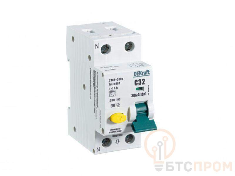 Автоматический выключатель дифференциального тока серии ДИФ-103 DEKraft; 1P+N; ном.ток 32 А; характеристика C; откл.способность Icn = 6 kA; ток утечки 30 мА; тип - АС; блок дифф.защиты – электронный; ширина – 2 мод. х 18 мм; монтаж – на DIN-рейку. АВДТ применяются в сетях напряжением до 220 В пер.тока для защиты человека от поражения электрическим током и электроустановок от сверхтоков и токов утечки. Аппараты ДИФ-103 являются более компактным вариантом АВДТ по сравнению с серией ДИФ-101.