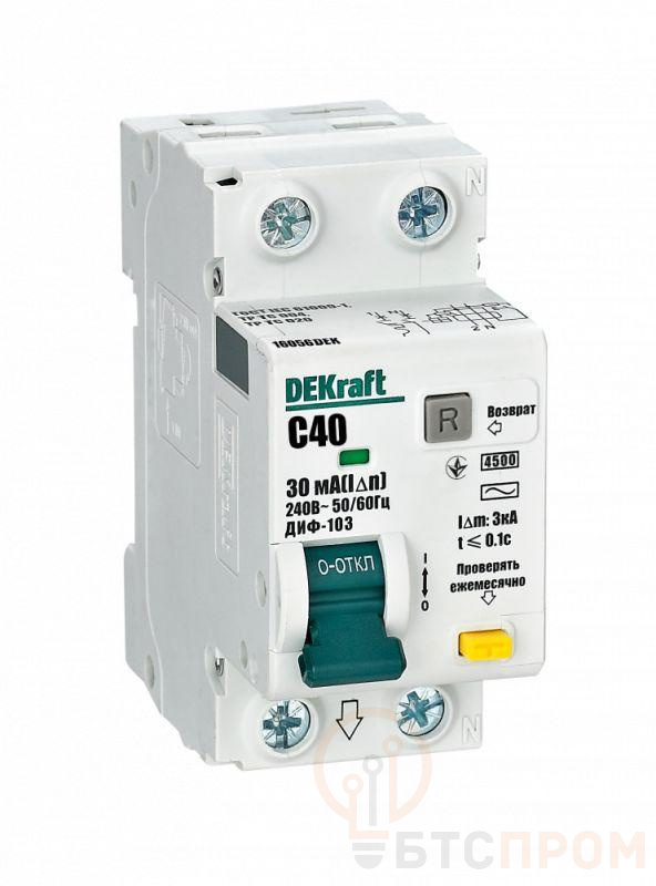 Автоматическими выключателями дифференциального тока серии ДИФ-103 Dekraft; 1N+P; номинальный ток 40 А; ном.дифф. ток 30 мА; тип дифференциального расцепителя - AC; кривая отключения - С; на DIN-рейку. АВДТ (автоматическими выключателями дифференциального тока) сочетают функции автоматического выключателя и УЗО (ВДТ), обеспечивают три вида защиты — от короткого замыкания, перегрузки и возникновения утечки тока (в частности, вследствие прикосновения человека к токоведущим частям). АВДТ с отключающей способностью 4,5кА применяются в распределительных, учётно-распределительных, телекоммуникационных щитах и др. в жилищном, гражданском строительстве, сельском хозяйстве, инфраструктуре объектов промышленности.