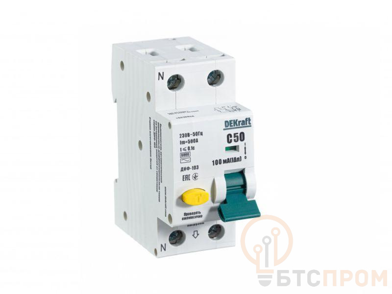 Автоматический выключатель дифференциального тока серии ДИФ-103 DEKraft; 1P+N; ном.ток 50 А; характеристика C; откл.способность Icn = 6 kA; ток утечки 100 мА; тип - АС; блок дифф.защиты – электронный; ширина – 2 мод. х 18 мм; монтаж – на DIN-рейку. АВДТ применяются в сетях напряжением до 220 В пер.тока для защиты человека от поражения электрическим током и электроустановок от сверхтоков и токов утечки. Аппараты ДИФ-103 являются более компактным вариантом АВДТ по сравнению с серией ДИФ-101.