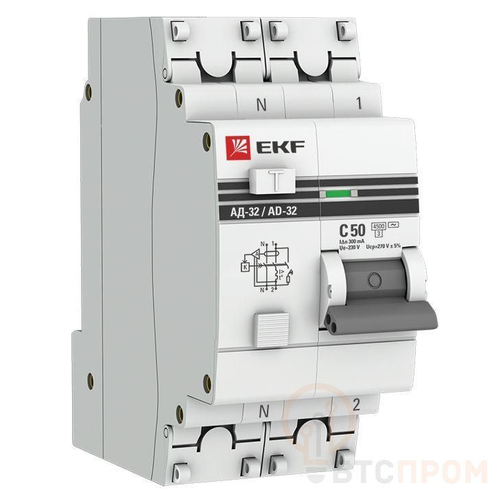 Выключатель автоматический дифференциального тока 2п (1P+N) C 50А 300мА тип AC 4.5кА АД-32 защита 270В электрон. PROxima EKF DA32-50-300-pro