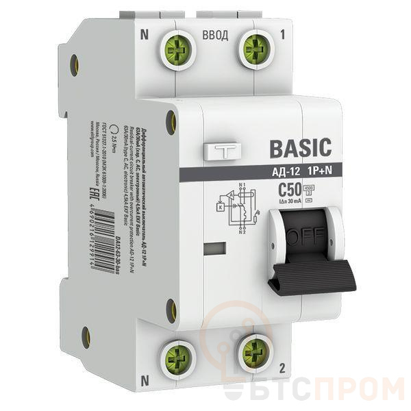 Выключатель автоматический дифференциального тока 2п (1P+N) C 50А 30мА тип AC 4.5кА АД-12 Basic EKF DA12-50-30-bas